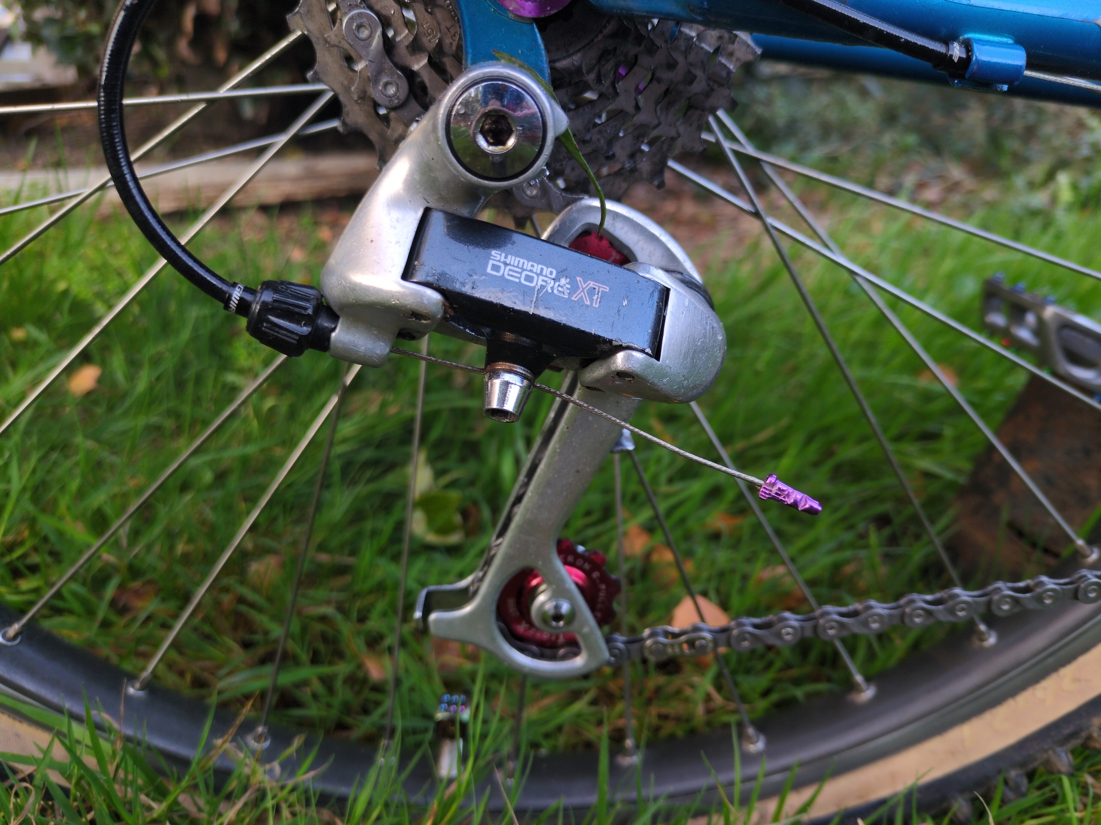 I originally got a matching XT front mech, but the earlier XT front mechs do not play well with the smaller chainsets that became common after around 1995; it's impossible on this bike to get the correct tight clearance against the outer chainring and have the cage not conflict with the chainstays. This Deore LX is period-appropriate and works as well as any other front mech.