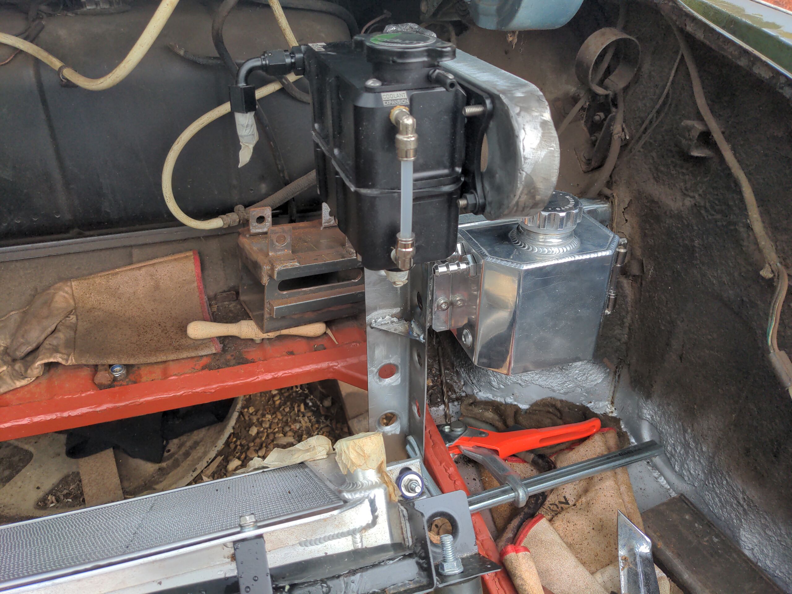 An expansion tank is necessary on a rear-mount radiator setup because the radiator is almost never the highest point of the pressurised cooling system. One of the things an expansion tank does is to relocate the radiator cap such that you can bleed the system. Actually, it's necessary on the Sierra Cosworth which my radiator is made for, and necessary on a lot of modern cars too; having an expansion tank gives a car's designers more freedom to place the radiator where they want it to be, rather than where it must be.