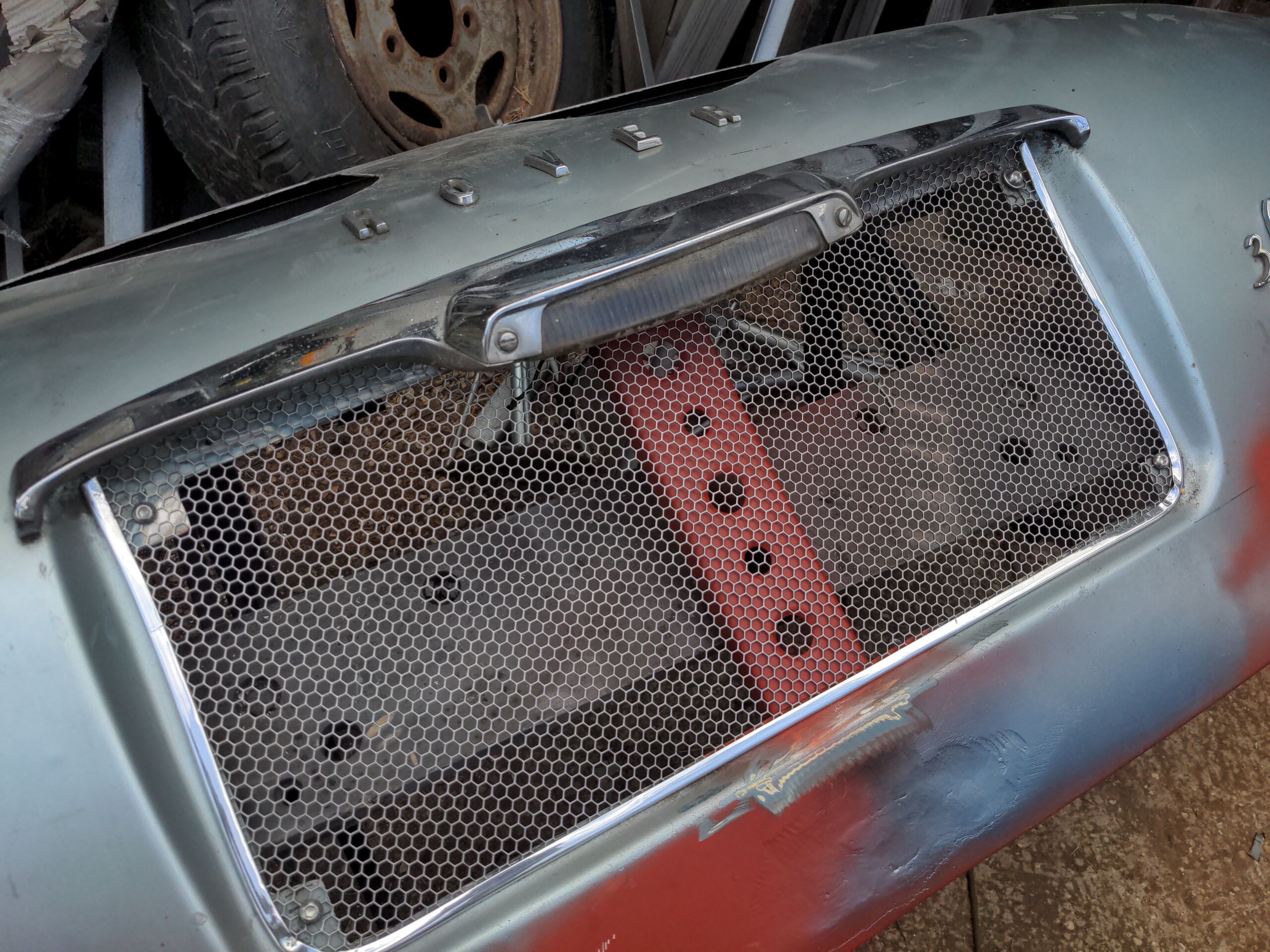 This entire area has been replaced by bolt-on mesh, and I've welded in a piece of dimpled steel in the centre to restore the strength to the boot lid. Much of that extra ventilation area will be lost when I fit a number plate here, but not all of it.