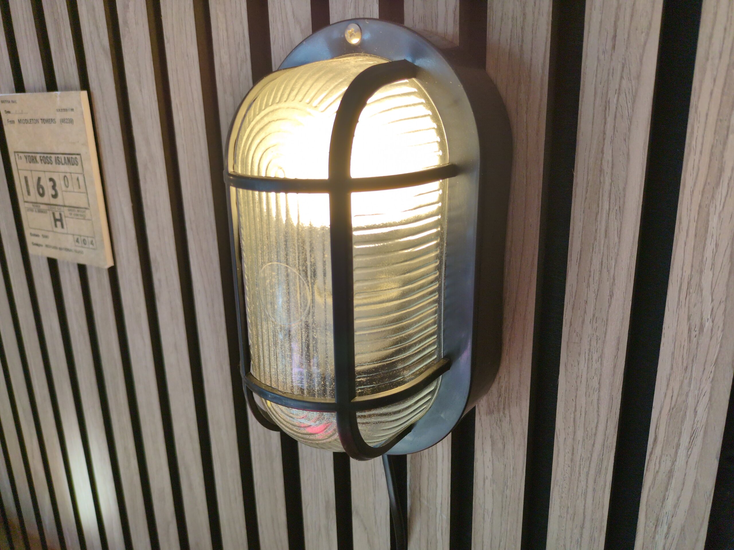 I modified some outdoor bulkhead lights. They look cool indoors. I needed the cable to exit from the bottom, rather than out the back, because that made it work better with a wood slat wall I installed; the black cable disappears into the black between the slats.