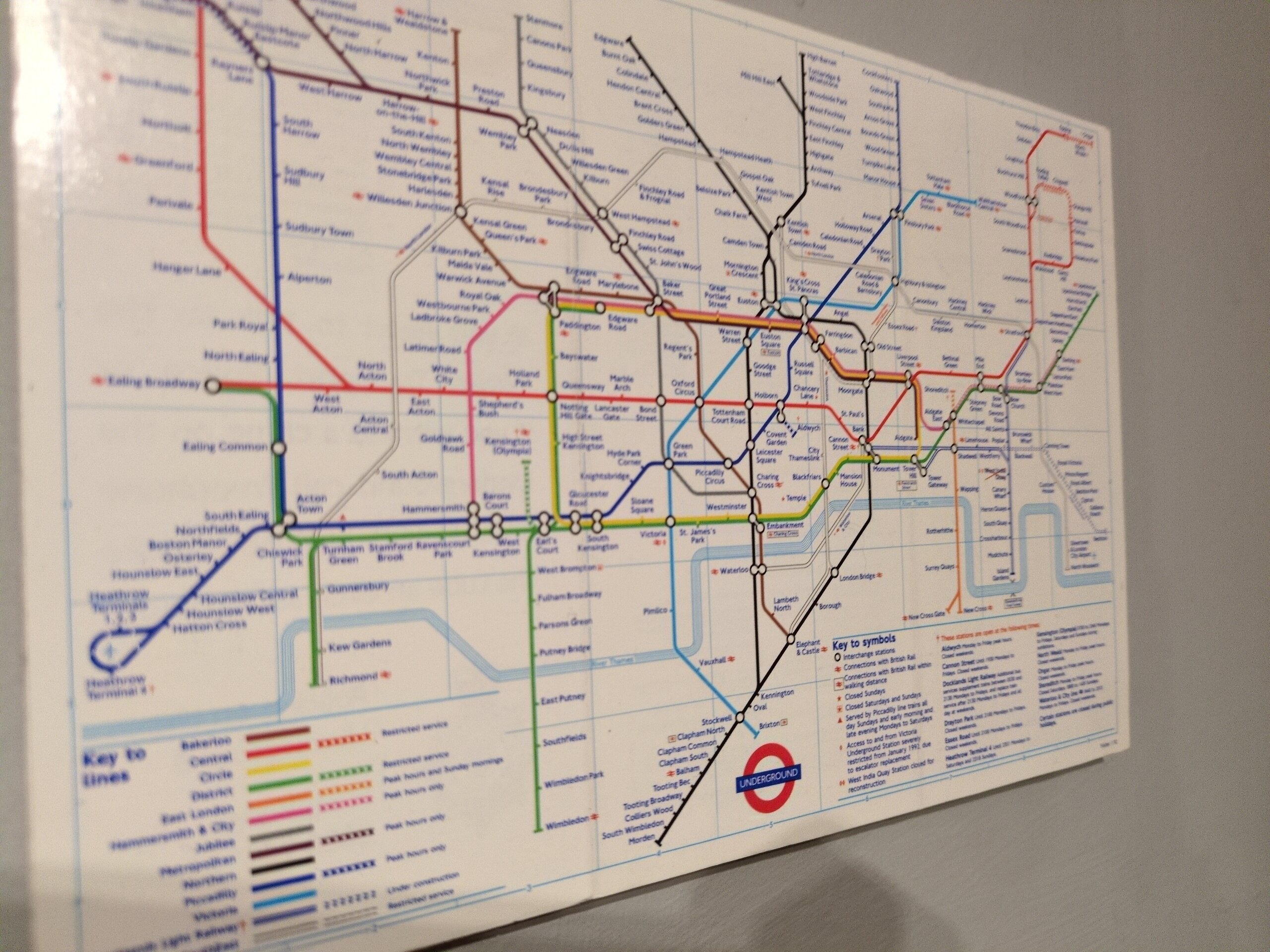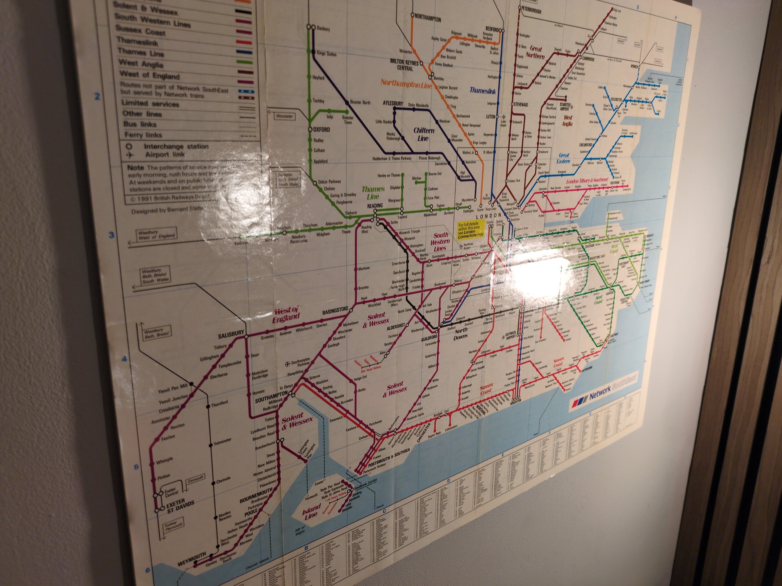 I found a Network SouthEast map from about 1991 on eBay. It's neither rare nor expensive, so I foam mounted it. I also clear-coated it with a rattle can of picture varnish to make it UV-proof and wipeable.